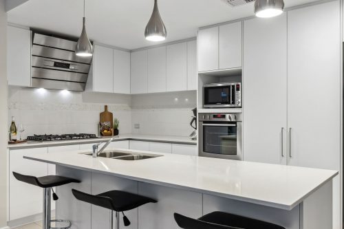 Kitchen – stone bench top, 2 x 600mm ovens with 5 gas burners, dishwasher, recess for plumbed in fridge, ample cupboards and preparation surface
