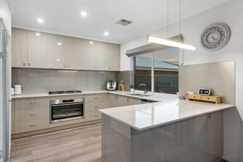 Kitchen – Stone bench top, recess for plumbed fridge freezer, dishwasher, 900mm appliances, pantry, ample cupboards and preparation surface