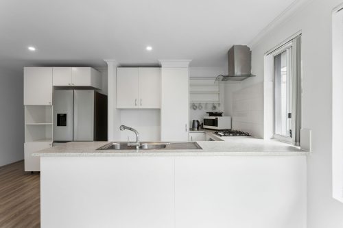 • Modern kitchen with 600mm Westinghouse cook top, 600mm Westinghouse oven, and large fridge recess