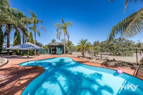 The sparkling pool sits amongst swaying palm trees and includes its own pergola — a perfect setting for relaxed afternoons, entertaining friends or simply enjoying the tranquil surroundings.