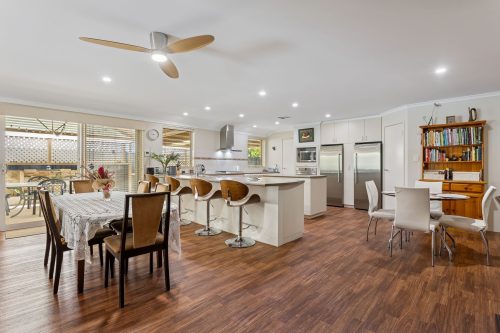 – Enormous open-plan living zone with ceiling fans and space for dining, lounge + kids activity