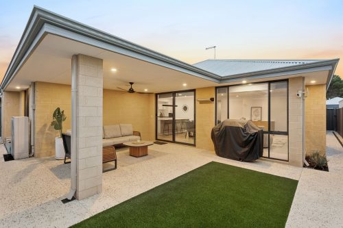 Step outside and you’ll find a lovely low-maintenance alfresco area complete with a ceiling fan, a small section of astro turf lawn, and poured aggregate concrete extending down the sides and across the rear of the home. It’s the perfect setup for buyers wanting an easy-care outdoor space that still feels inviting and functional.