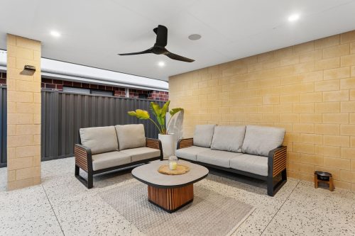 – Low-maintenance alfresco with ceiling fan