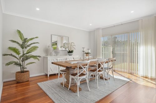 The manicured front garden and portico create a welcoming first impression. Double entry doors open to rich jarrah timber flooring that continues through to the main living spaces complemented by a fresh neutral colour palette and high recessed ceiling.